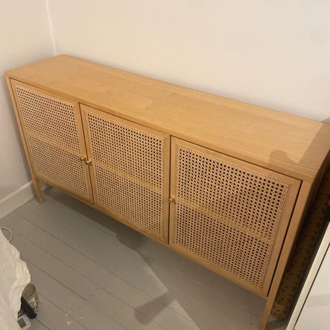 Skänk, troligtvis IKEA, 130 cm bred, 82 cm hög och 43,5 djup. Vit med mörkt träfärgad toppskiva. 3 utdragbara lådor och 3 dörrar. Bra bruksskick, fräsch!