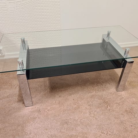 IKEA soffbord . Ovalt bord med bordsskiva i glas och underhylla i mörkbrunt trä eller träfaner. Bordet har fyra ben och en öppen hylla undertill som kan användas för förvaring av till exempel tidningar eller fjärrkontroller. Passar som soffbord i vardagsrum eller liknande utrymmen.