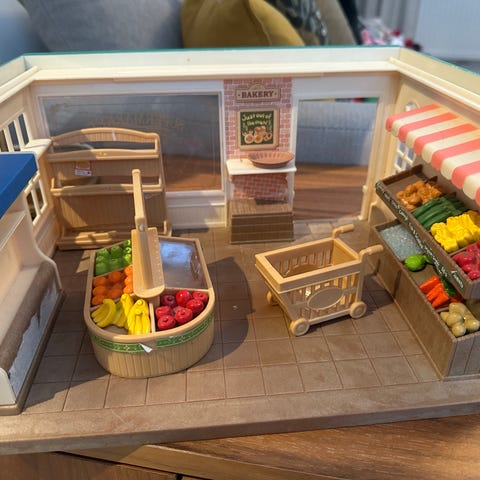 Sylvanian Families lekset med flera hus, möbler och djurfigurer. Setet innehåller bland annat bostadhus, affär, kiosk, lekplats, bil, kaninfamiljer, igelkottsfigurer, ekorrfigurer i olika storlekar, samt tillbehör som sängar, vagnar, stolar och små inredningsdetaljer. Passar för lek där barn kan skapa egna miljöer och berättelser med figurerna och husen.