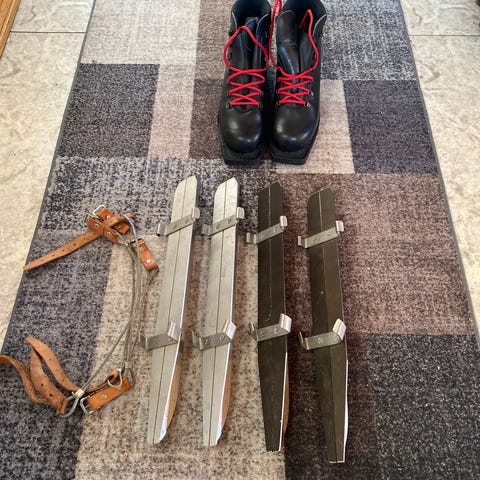 Långfärdsskridskor Almgrens 50 cm snabbindning. Pjäxor Crispi strl 39. Hämtas i Uppsala.