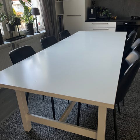 Ett nätt och lättmöblerat vitt matbord med plats för 4 eller 6 personer. Väl omhändertagen och skivan än i fint skick.