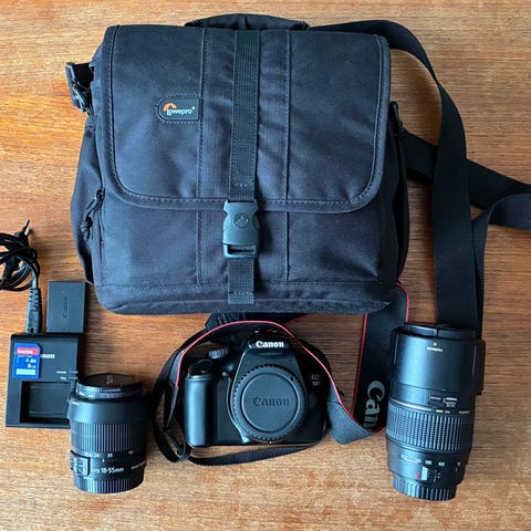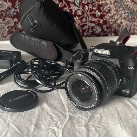 Canon EOS 1000D digital systemkamera. Kameran är en digital spegelreflexmodell (DSLR) med utbytbara objektiv. På bilderna syns kamerahus med standardzoomobjektiv. Passar för allmän fotografering som vardagsbilder, resor och enklare natur- eller porträttfoto. Levereras utan det 70-200mm objektivet