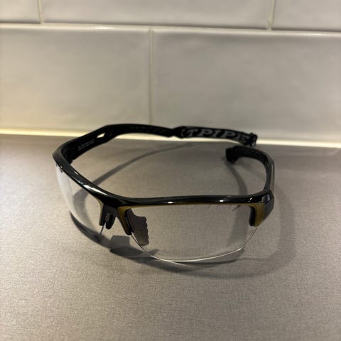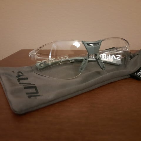 Sportglasögon i svart med transparenta linser. Bågarna har en sportig, omslutande form som ger god täckning runt ögonen. Glasögonen levereras med ett vitt fodral med dragkedja för förvaring och skydd när de inte används.