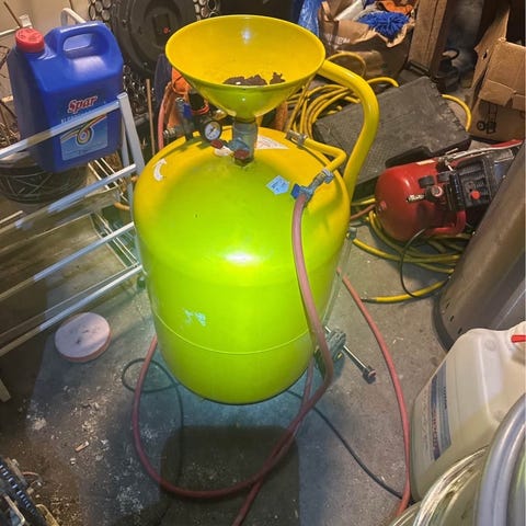Friköpt argonflaska med monterad tryckregulator och två manometrar. Flaskan har skyddsbygel runt ventil och regulator. Ca 60% gas kvar.