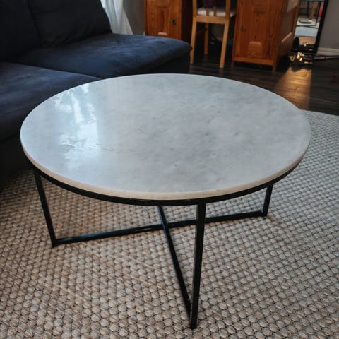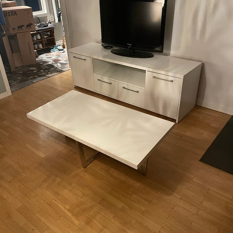Mio soffbord och tv-bänk med marmormönstrad skiva vit metallstativ