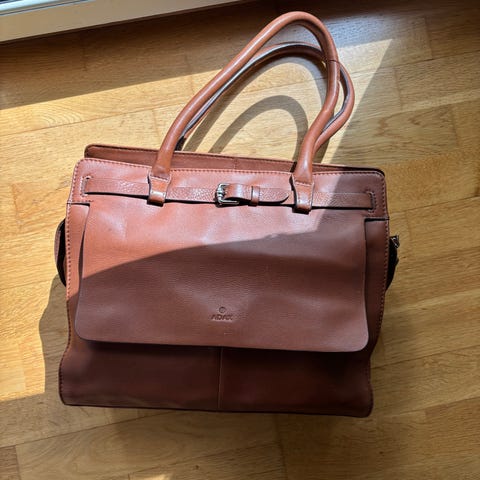 Handväska i läder och med metalldetaljer. Insida med litet fack och fack med dragkedja.