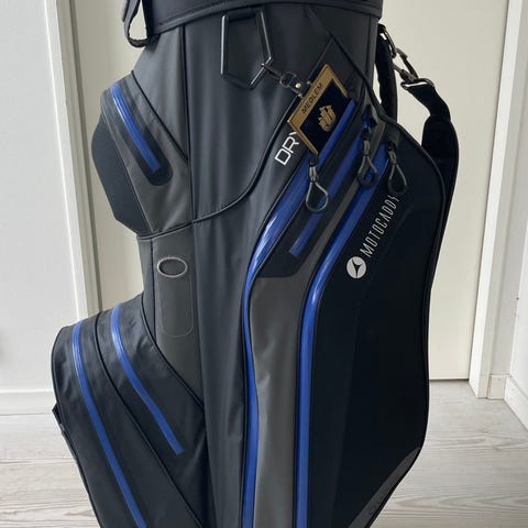 MotoCaddy Dry Series golfbag i grå och röd färg. Modellen är en vattentålig cartbag med flera ytterfickor med dragkedja för förvaring av golfutrustning och tillbehör. Väskan har bärhandtag och är avsedd att användas på golfvagn eller golfbil.