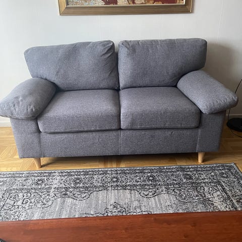 Säljer min EGENSE 2‑sits soffa från JYSK i mörkgrått tyg.