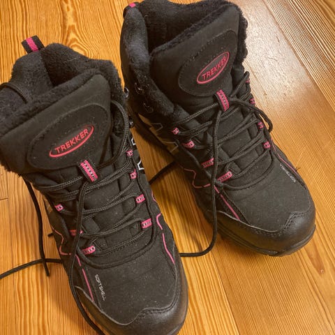 Lätta och värmande promenadsko med dubbar. Svarta med rosa detaljer. Mycket mjukt och komfortabelt foder. Perfekta för hundpromenader och vinteraktiviteter. Märke: Trekker.