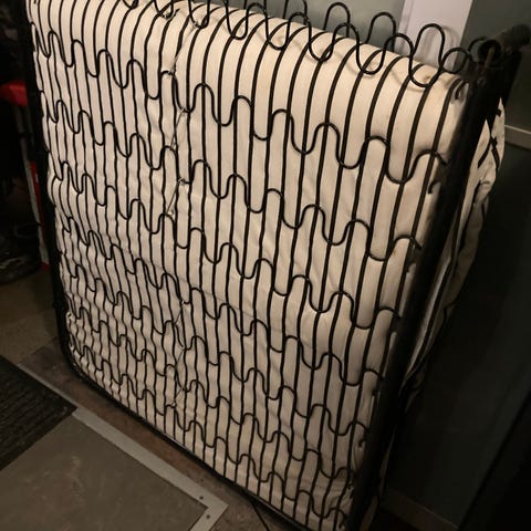 IKEA Sandvik hopfällbar extrasäng med måtten 80x190 cm. Sängen har en blå stålram och är utrustad med hjul för enkel förflyttning.Se bilder na, En av kölarna var trasig, men den har varit fastbunden med rep och det påverkar inte dess användning.
