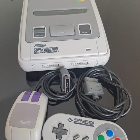 Ett skandinaviskt SNES komplett med kablar i kartong med 2st turbokontroller, 2st spel samt manual till ena spelet. En del av manualerna finns kvar, men inte själva bruksanvisningen.