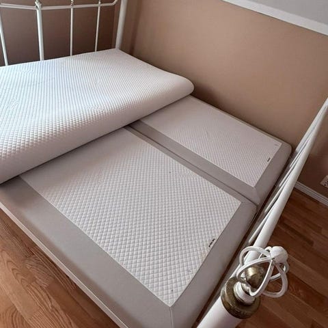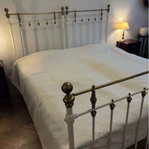 Double bed with mattress topper, 2 large chest of draws and 2 adjustable height legs to create a high bed. Small stool included. Only sold together.