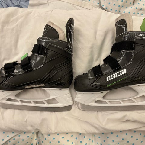 Bauer ishockeyskridskor för barn i storlek EU 32. Modellen är svart med blå detaljer och har vit TUUK-hållare med stålskena. Snörning framtill för justerbar passform och vadderad insida för ökad komfort. Passar för ishockey och allmän åkning på is för barn med skostorlek cirka 32.