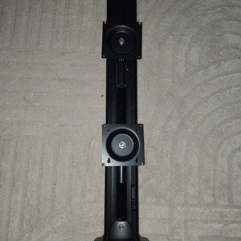 Skärmfäste med dubbla monitorarmar i svart metall. Fästet har VESA-plattor för montering av två bildskärmar. Justerbara armar gör det möjligt att vinkla och höjdjustera skärmarna. Levereras med monteringsdetaljer enligt bild. Passar som övrigt datortillbehör för skrivbord eller arbetsplats där man vill montera skärmar på arm istället för direkt på bordet.