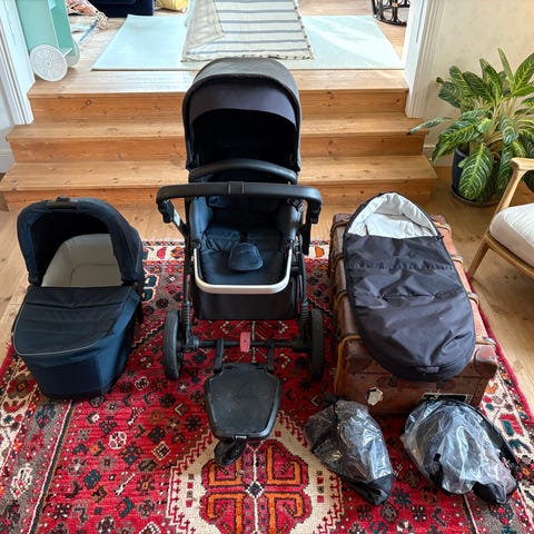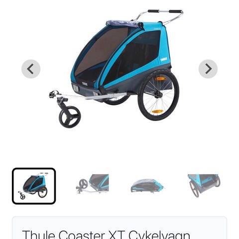 Thule cykelvagn/barnvagn/dubbelvagn i blå färg med två stora bakhjul och ett mindre framhjul för användning som cykelkärra. Fungerar utmärkt även som promenadvagn, vilket är vad vi använt den till.