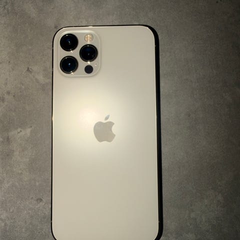 Apple iPhone 12 mobiltelefon med 128 GB intern lagring. Modellen på bilderna visar en grön färgvariant. Telefonen har pekskärm och kör iOS, enligt inställningsbilderna version 26.2.1. Batterihälsa visas som 100 % maximal kapacitet på skärmbilden.