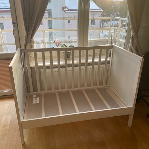 Very lightly used crib as we decided to co-sleep. Crib can be in four stages - high level for newborn, middle level, then lowest level, and a toddler setting barrier included. The highest quality Ikea mattress (Himlavalv, value kr 1495), also barely used, is included. Pickup in Märsta.
