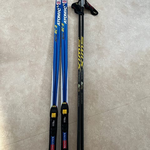 Madshus Hypersonic C3 längdskidor med Salomon-bindningar och tillhörande Swix-stavar. Längd på skidor 208 cm och på stavar 157 cm.