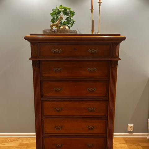 Ljuvlig hög byrå från sent 1800-tal🤠🤎 Denna vackra byrå är inspirerad av den gamla landsbygden! En varm beige kulör tillsammans med en washpaint teknik för att få fram de charmiga bruna lådorna🤎🌿
