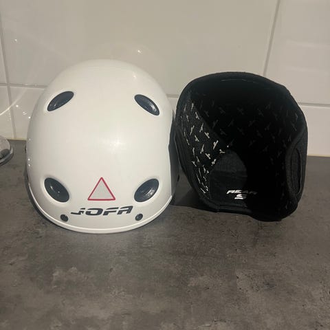Tävlingshjälm med ventilationsöppningar upptill och bak samt justerbart spänne under hakan. Invändigt finns vaddering och meshpaneler för komfort. På baksidan finns fäste för tillbehör. Medföljande metallbygel visas på bild, som kan användas som käkbygel vid slalomåkning. Hjälmen är mycket välskött, endast litet använd och i fint skick.