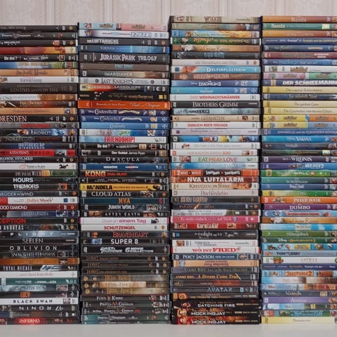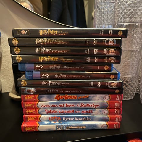 Samling med blandade DVD-filmer av olika titlar och genrer. Flera kända filmer som Juradsic Park, IndianaJones, Star wars ingår. Dessutom filmserier- 6 st Harry Potter(flera st i många fodral) Även barn - och ungdomsfilmer som Barbie, Avatar, Toy Story och Lion King. Försäljningen avser fysiska DVD-skivor med tillhörande fodral enligt bild. 43 st fodral med flera skivor i vissa.