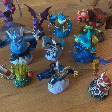 Skylanders figuriner med portal för Xbox 360. Flera olika karaktärer i blandade färger enligt bilder. Portalen ansluts med kabel till Xbox 360-konsol och används tillsammans med kompatibla Skylanders-spel. Plastfigurerna placeras på portalen för att aktiveras i spelet. Antal och specifika figurer framgår av bilderna.