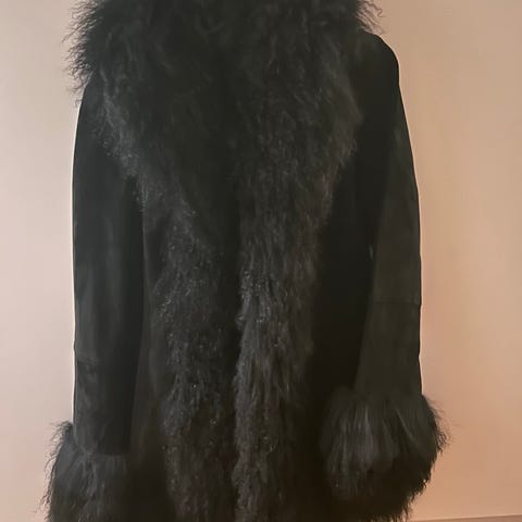 Tweedcape med pälsdetaljer (fuskpäls). Fint och effektfullt foder i lila.