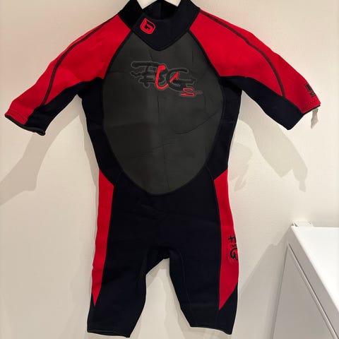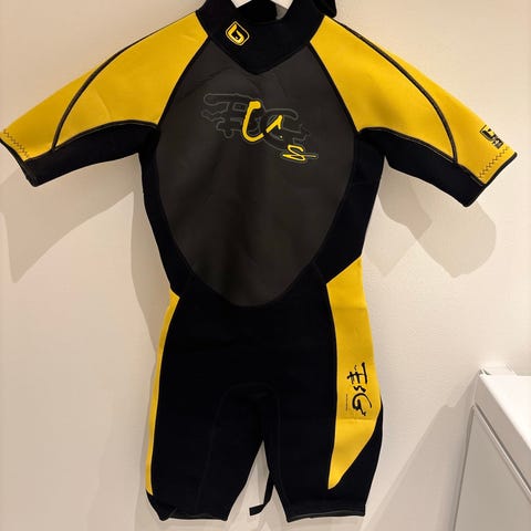 Base 2/2 våtdräkt för barn med korta ärmar och korta ben. Dräkten är tillverkad i neopren och har paneler i gult, svart och grått. Dragkedja bak med rem för enklare av- och påtagning samt hög krage med kardborrestängning. Passar för vattensport och bad i svalare vattenförhållanden.