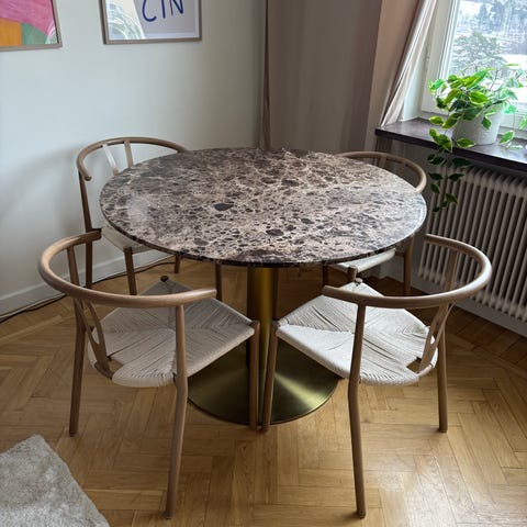 Kiwi stol har en lätt vadderad sits med tunna ben i lackerad metall. Kan levereras i Sthlms-området enligt ök.