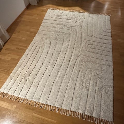 Mio matta i patchworkstil med flerfärgat mönster i främst beige, bruna och röda toner. Rektangulära fält med varierande mönster ger ett livligt uttryck. Passar som golvmatta i exempelvis vardagsrum, sovrum eller hall. Material och exakta mått är inte angivna.