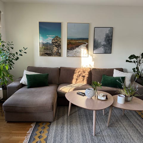 Mio hörnsoffa i brun textilklädsel. Soffan har schäslongdel och raka armstöd samt flera ryggkuddar för stöd. Passar som sittmöbel i vardagsrum och ger plats för flera personer att sitta bekvämt. Kan placeras i hörn för effektiv användning av rumsytan.