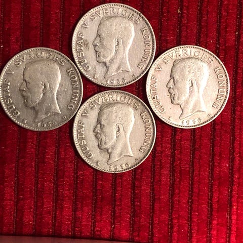 Samling svenska 1-kronorsmynt i silver. Mynten visar kungaporträtt på ena sidan och riksvapen med texten "Sveriges konung" på den andra sidan. Passar för myntsamlare eller som material för exempelvis hantverk eller dekoration. Antal mynt och exakta årtal framgår av bilderna.