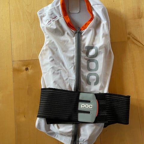 POC Giant dräkt i storlek 160. Dräkten är huvudsakligen svart med en orange ärm och vit POC-logotyp. Materialet består av 80 % polyester och 20 % elastan. Plagget är märkt CE och tillverkat i Frankrike.