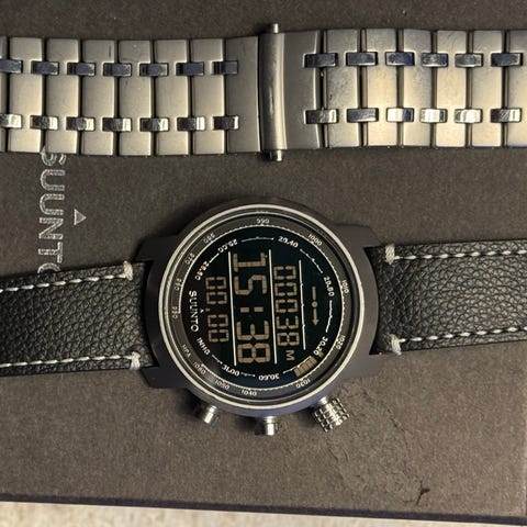 Suunto Core Brushed Steel armbandsur för unisex med boett i borstat stål och svart läderarmband. Uret har digital display med tid, datum och olika funktionslägen. Klockan är utformad som ett robust sport- och friluftsur med tydlig skärm och knappar runt boetten för att styra funktionerna. Passar både vardagsbruk och aktiviteter utomhus.