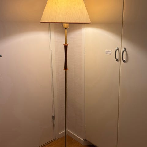Lampan är i fin skick. Höjd 155cm, skärmens diameter 54cm. Kan levereras Stockholm centralt.