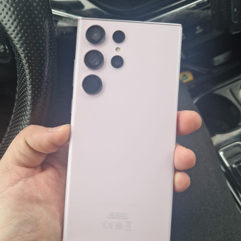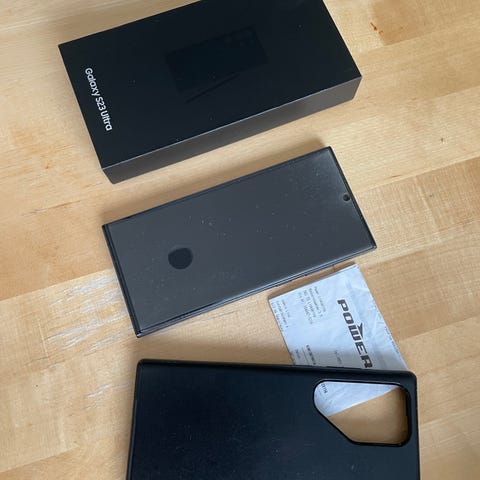 Samsung Galaxy S24 Ultra mobiltelefon med 256 GB internminne. Modellen på bilderna är i en ljus beige färg och levereras med S Pen-stylus. Telefonen har stor pekskärm och flera bakre kameror med olika brännvidder. På bilderna syns även två olika skal som kan användas som skydd och för extra funktionalitet. Passar för användning av appar, surf, foto, video och anteckningar med pekpenna.
