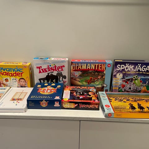 Paket med blandade sällskapsspel och familjespel. I samlingen ingår flera olika typer av spel, bland annat frågespel, lottospel, kortspel och brädspel. Spelen har varierande teman, till exempel allmänbildning, Sverige-frågor, minnesspel och klassiskt lotto. Passar för spelkvällar i familj eller med vänner och kan spelas av flera deltagare samtidigt beroende på speltyp. Alla spel levereras i sina originalkartonger enligt bilderna.
