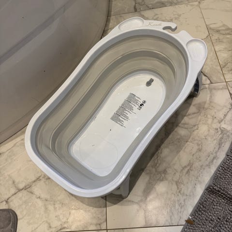 Stokke hopfällbart badkar för barn i vit och grå färg. Rektangulär modell med halkskydd i botten och integrerad upphängningsögla för enkel förvaring. Passar för bad av spädbarn och småbarn i hemmet eller vid resor där ett kompakt badkar behövs.
