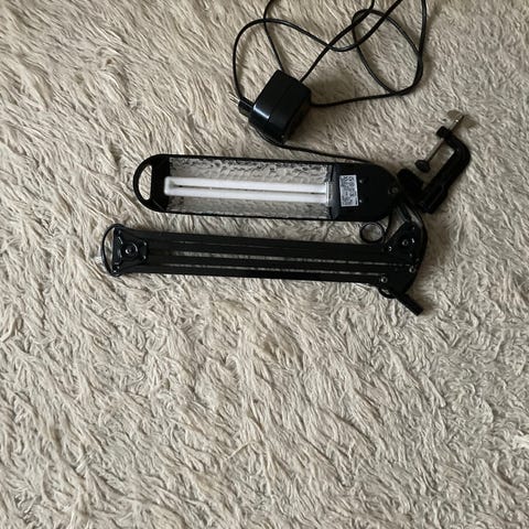 Stativet har handtag med skumgummigrepp och justerbart lamphuvud.
