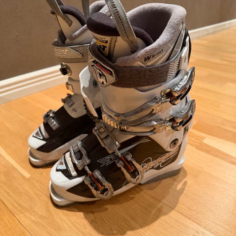 Slalompjäxor 22,5 och rosa skidstavar 100 cm