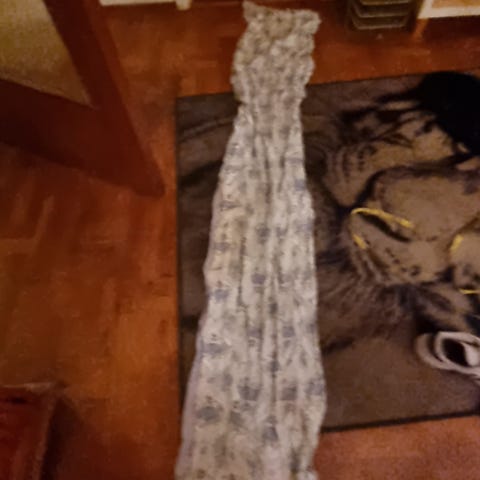 IKEA gardin i röd färg med mönstrad design. Tyget har dekorativt mönster och spetsliknande kant. Passar som fönstergardin eller rumsavdelare. Observera att det finns en större reva/öppning i tyget som kan behöva lagas eller anpassas vid användning.