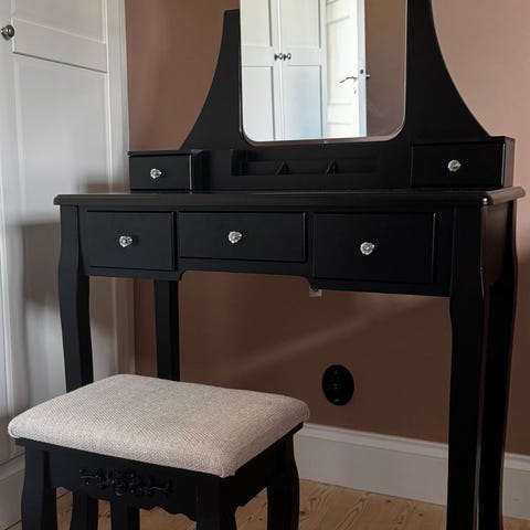 Säljer mitt sminkbord med sminkspegel! Mycket förvaring i bordet och dimbart ljus.