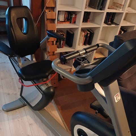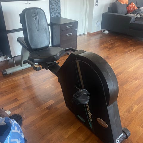 Life Fitness 95Re motionscykel i liggande utförande. Cykeln har en grå ram med integrerat ryggstöd och sits. Utrustad med stor display med knappar för justering av motstånd och program. Pedalerna har remmar för att hålla fötterna på plats. Lämplig för konditionsträning inomhus och kan användas av både kvinnor och män.