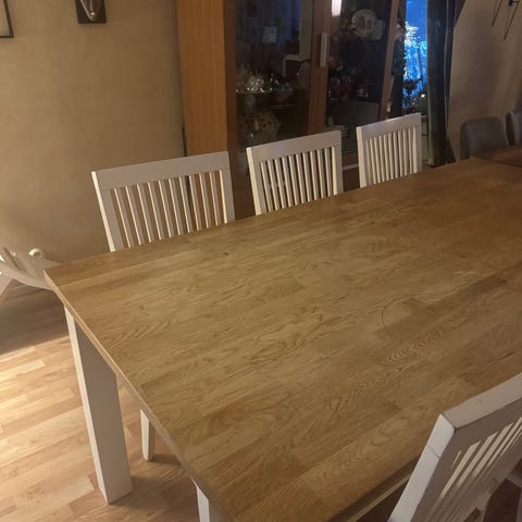 Matbord In Living Ratliff är ett vitt matbord i modern stil. Den högblanka ytan är lättskött och underredet är centrerat till mitten av bordet vilket underlättar när du ska komma fram med dammsugaren. Det moderna formspråket har en karisma som gör bordet till ett tufft inslag i din inredning. Tack vare den praktiska iläggsskivan som ingår får alla plats runt matbordet, även när ni är många. 4 Nibestolar i svart tyg med grått överdrag. Nypris 5999:- för två år sedan