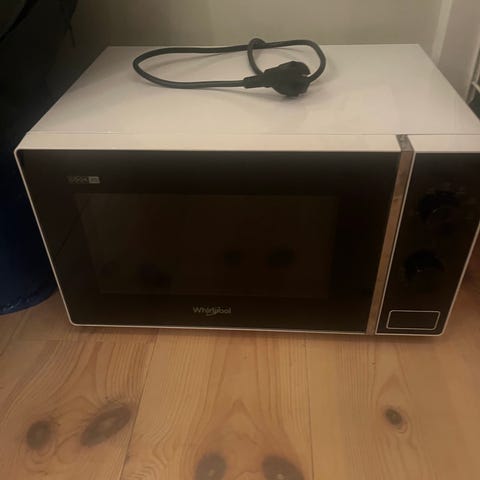 Whirlpool mikrovågsugn i svart utförande. Front med glaslucka och sidopanel med manuella vred för inställning av effekt och tid. Invändig vit kammare med roterande tallrik. Passar för uppvärmning och enklare tillagning av mat i kök, exempelvis placerad i skåp över ugn eller bänk.