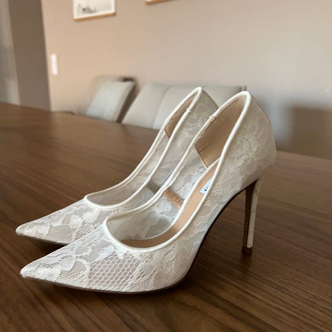 Prada klackskor i storlek 38. Modellen är klassiska pumps med smal, hög klack och spetsig tå. Skorna är vita med svart sula och innersula med Prada-logotyp. I läder, kommer med dustbag