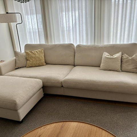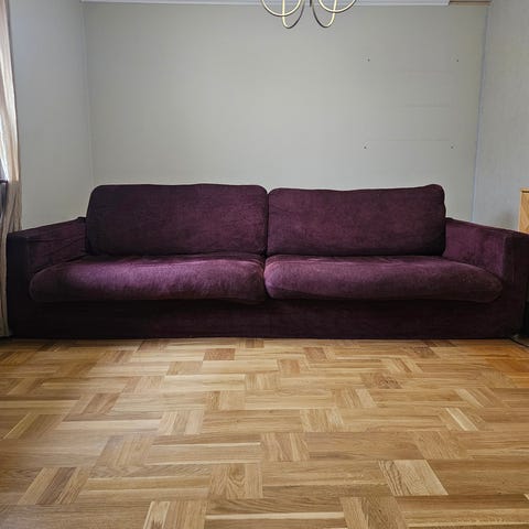 Fin och fräsch soffa. Unik och fin färg. Nyligen kemtvättat. Liten reva vid undersidan på pallen.