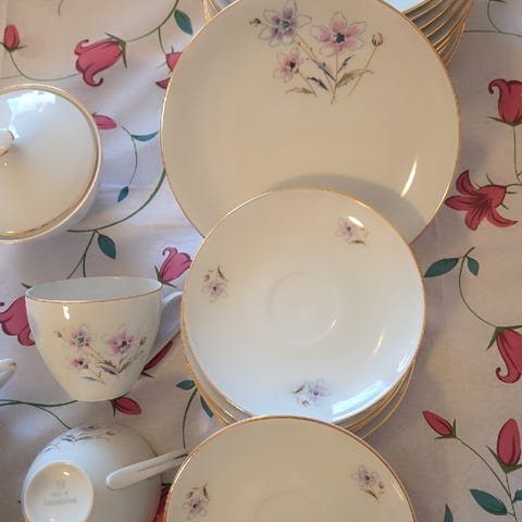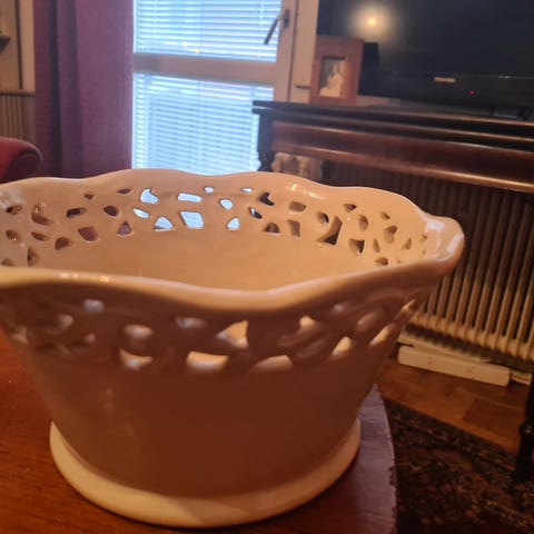 Vit porslin med liten guldrosa kant, 20x20 cm. Kan postas, porto tillkommer eller mötas upp i Stockholm city. Nyskick!