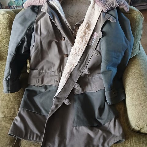 En fältjacka 90 med måtten 180cm och 85kg. Förra ägaren färgade jackan till att vara lite mörkare av okänd anledning