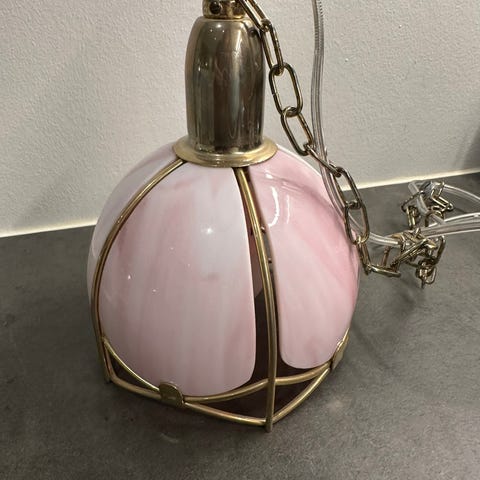 Rejäl fot i mässing som har en del tyngd i sig och skärmen i glas med blomma.